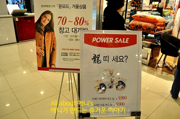 특히 70~80%의 대박세일을 알리는 창고대개방 포스터와 내년 용띠해를 맞아 용 캐릭터 상품을 세일하는 것이 눈에 띄는데요..